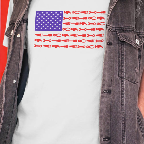 The USA Tool Flag White T-Shirt is a tribute to the hard-working men and women who build, repair, and keep America running. Featuring our signature flag made of red, white, and blue tool silhouettes, this shirt blends patriotism with the pride of the trades.